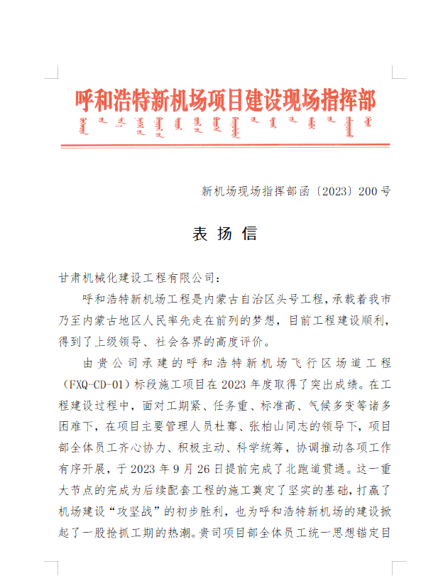 2023年9月28日,呼和浩特新機場項目建設現場指揮部給我司發來表揚信,信中充分肯定了我司在呼和浩特新機場項目建設中項目部全體員工統一思想錨定目標、精心組織管理、發揚艱苦奮斗、迎難而上、攻堅克難的鐵軍精神,合理調配資源、強化安全質量管理,圓滿完成了指揮部下達的各項施工任務。