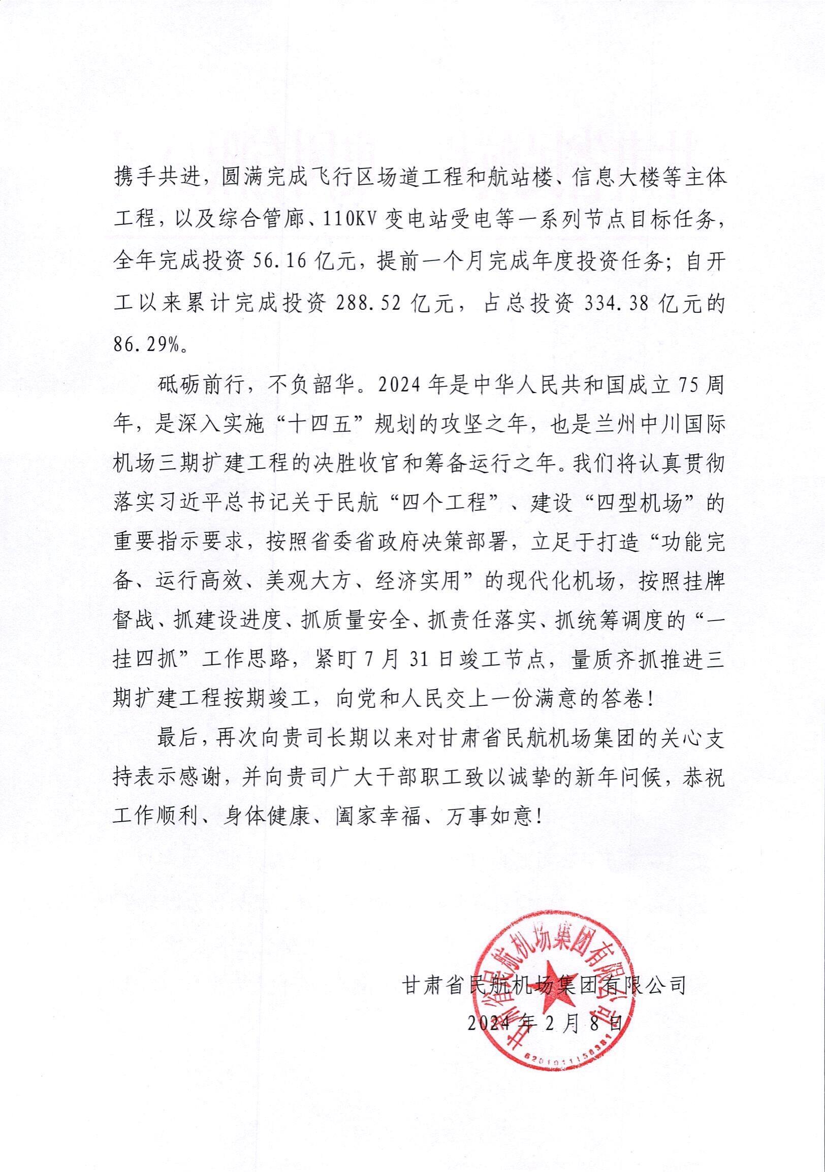 2月8日,新春佳節來臨之際,我司收到來自甘肅省民航機場集團有限公司的感謝信。